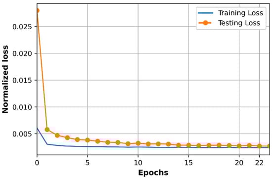 The learning curve based on normalized loss (MSE) and accuracy (R2 score) of the DNN model are observed with the training dataset and testing dataset as shown in Figure 8 and Figure 9.