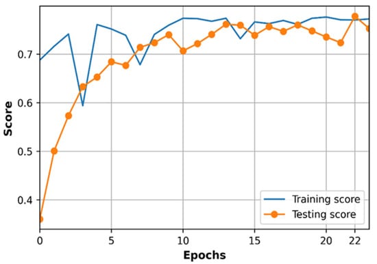 As we can see in Figure 8, the training loss is lower than the testing loss, and both training loss and testing loss are changing at very closed values during training progress. The loss in Figure 8 is the normalized loss which is determined in the range from 0 to 1 since the training dataset and testing dataset are normalized before processing by DNN. The training loss and testing loss curves converge at epochs at the value of MSE loss equal to . Path loss prediction is a regression problem therefore we use R2 score to evaluate the performance accuracy of the model as shown in Figure 9. In contrast to loss curves, the accuracy of training data is almost higher than the accuracy of testing data, and the two accuracy curves are at very closed values at epochs, in which R2 is around 0.77 for training and testing datasets, respectively. The curves of loss and accuracy based on training and testing datasets in Figure 8 and Figure 9 shows that the optimized DNN model works well on both the training dataset and testing dataset, which does not cause overfitting or underfitting problems. Underfitting can be observed when the error cannot be minimized during the training phase while overfitting occurs when the error between training and testing dataset cannot be minimized [40]. We can see that the error in the training dataset is small, and the gap between error on the training dataset and testing dataset is small at the convergence point ( epoch).