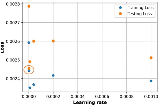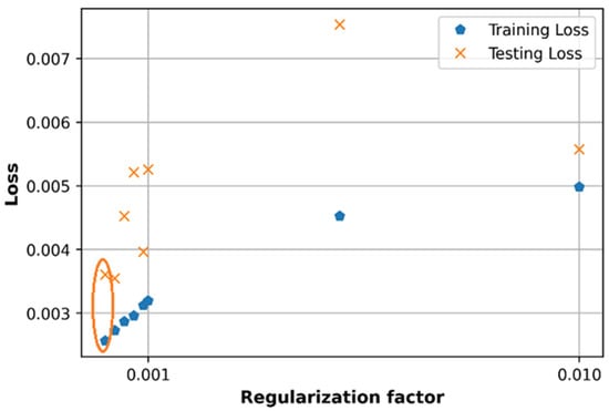 The loss and accuracy are observed versus values of regularization factor in the set [0.0001, 0.0003, 0.0005, 0.0007, 0.0009, 0.001, 0.01] as shown in Figure 19 and Figure 20. The loss in case of produces the lowest training loss and testing loss compared to other cases of regularization factor, which can be seen in the orange circles in Figure 19.