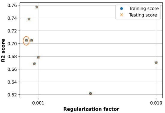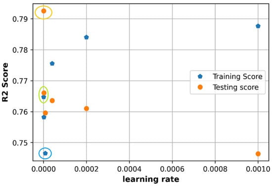 The initialized learning rate at is a good candidate of initialization value since it does not produce a good performance at first and needs to be adjusted to get a lower error and higher accuracy. The best value of loss in Figure 13 (about 0.00245) is still higher than that in the random search method (0.0023). The best accuracy on the test set in Figure 14 (0.79) is higher than that in random search (0.77), however, at this point (in orange circle) the values of the R2 testing score is much different from the value of R2 training score (in blue circle). The best candidate of R2 score in Figure 14 can be the point at the green circle, which gives an R2 testing score around 0.765 and this value is closed to that in a random search.