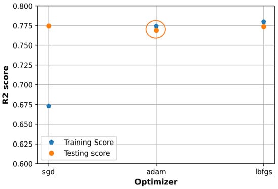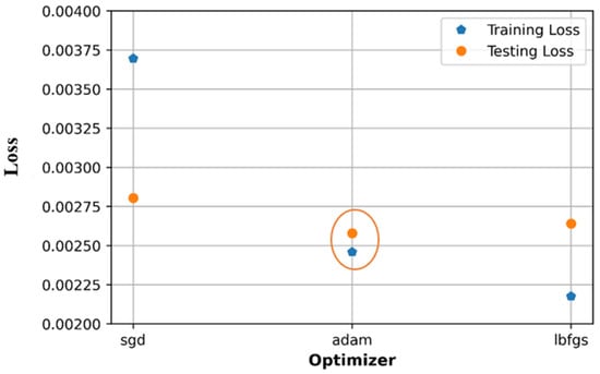 There are three optimizers observed to tune the hyperparameters which are stochastic gradient descent (SGD), Adam, and L-BFGS algorithm. As shown in Figure 15, the training loss and testing loss of Adam optimizer get the lowest values compared to those of SGD and L-BFGS; in addition, the training loss value and testing loss value of Adam optimizer are not too different. The training and testing accuracy of the Adam and L-BFGS optimizers are at very closed values as in Figure 16 based on the R2 score. However, Adam is a better option since it shows better performance on MSE loss as shown in Figure 15 (highlighted by orange circle).