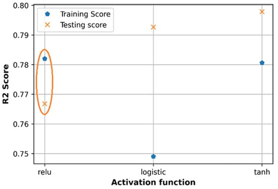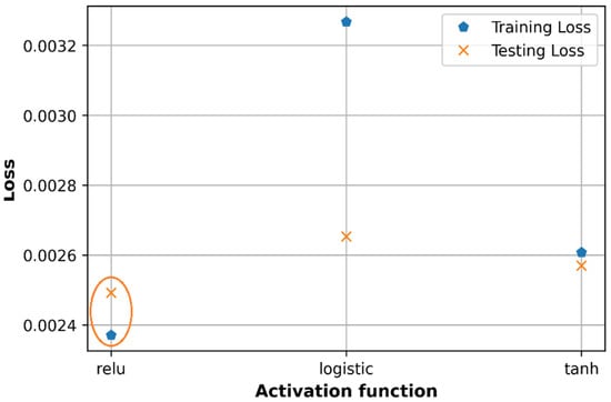 The three most popular activation functions are selected for tuning hyperparameters model which includes Relu, sigmoid logistic, and Tanh activation functions. All three activation functions are used to evaluate the performance of the model independently as in Figure 17 and Figure 18. As shown in Figure 17, the difference between training loss and testing loss in the case of Tanh activation function is smaller than that in the case of Relu activation function. In contrast, the training loss is much greater than the testing loss in the case of sigmoid logistic function. The Relu activation function is thus a good candidate because it produces the lowest loss.