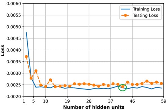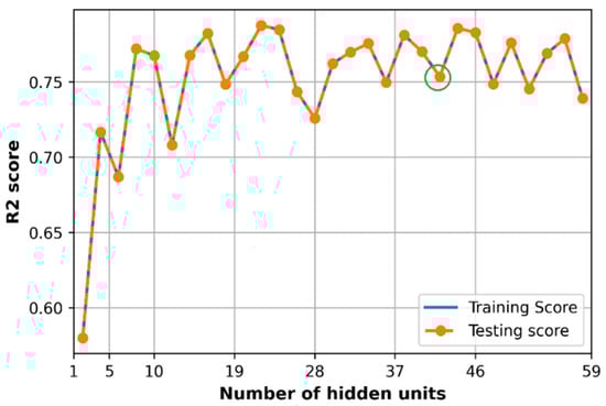The number of hidden layers is considered to be three layers, and the number of hidden units (same at each hidden layer) is observed to evaluate the loss and accuracy of the training and testing dataset. As we can see in Figure 21, the training loss and testing loss converge at a minimum value of 0.0024 at hidden units equal to 41 units which are presented in the green circle, and at this point, the R2 score gets about 0.75 as in the green circle in Figure 22.