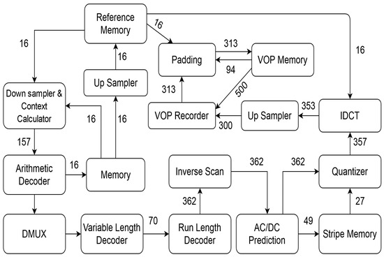 Video object plane decoder (VOPD) is an application comprising several sub-tasks: run-length decoder, downsampler, quantizer, etc. These sub-tasks require communication among themselves at the rates specified in MBs on the edges between them. Figure 5 represents the architectural diagram of the VOPD, while Figure 2 illustrates the graphical representation of the VOPD tasks. VOPD consists of 16 sub-tasks having 21 edges labeled with distinct communication bandwidth.