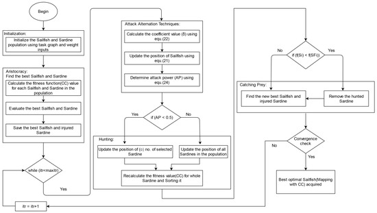 The initial sailfish and sardine populations are generated using the initial mapping and weight of the task graph given at time . Considering the settings of parameters of the proposed algorithm, the fitness value, which is the communication cost (CC) of the best sailfish (i.e., mapping solution), is computed. (For CC, refer to Equation (8) which is defined in Section 5). Later, the positions of sailfish and sardine are updated in in consideration of attack power (AP). (For position updates of sailfish and sardine, refer to Equations (21) and (27), respectively. For AP, refer to Equation (24) in Section 5). After updating the positions, the optimized result of mapping (sailfish) can be obtained.