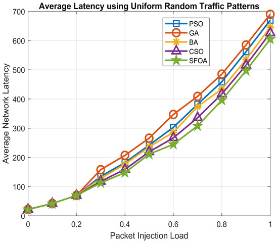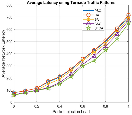 Figure 7 depicts the graphical results of the average network latency in contrast to different rates of injection load under uniform random traffic patterns. It is evident from this graph that SFOA outperformed PSO, GA, BA and CSO by 11.23%, 16.40%, 8.65% and 4.42%, respectively, for uniform random traffic pattern. Furthermore, Figure 8 illustrates the graphical results of the average network latency compared to different injection load rates under tornado traffic patterns. It can be seen from this graph that SFOA outperformed PSO, GA, BA and CSO by 24.06%, 25.45%, 13.89% and 5.82%, respectively, for tornado traffic patterns.