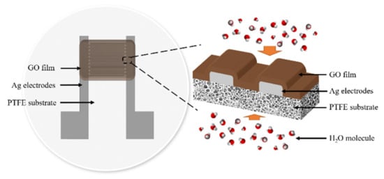 A flexible capacitive humidity sensor consists of a porous PTFE substrate, a pair of Ag interdigitated electrodes, and a GO sensitive film, as shown in Figure 1. The length of each electrode is 7 mm, the overlap length is 5 mm, and the electrode width and spacing are both 200 µm.
