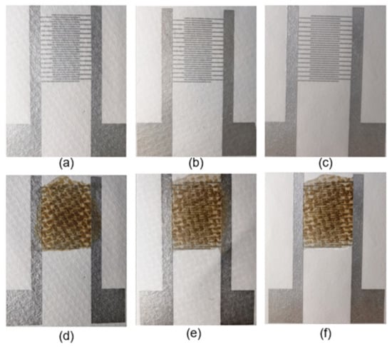 Photographs of the interdigitated electrodes on different substrates: (a) bare hydrophobic PTFE, (b) ethanol-treated hydrophobic PTFE, (c) hydrophilic PTFE. GO on the interdigitated electrodes: (d) bare hydrophobic PTFE, (e) ethanol-treated hydrophobic PTFE, and (f) hydrophilic PTFE.