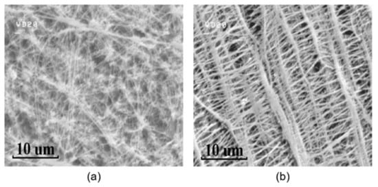 The surface microstructures of the PTFE membranes and the GO films coated on different PTFE substrates are investigated with a scanning electron microscope (S-4500, HITACHI, Tokyo, Japan) at an accelerating voltage of 15.0 kV after the samples are coated with platinum. The SEM image of the porous hydrophobic and hydrophilic PTFE substrates are shown in Figure 3, respectively. Both hydrophobic and hydrophilic PTFE substrates have a random porous network structure, and as a result, water molecules can easily go through the network structures. Therefore, the back side of the substrate is also open to the humidity environment, as shown in Figure 1 so that the dynamic characteristics of the flexible capacitive humidity sensors can be improved.