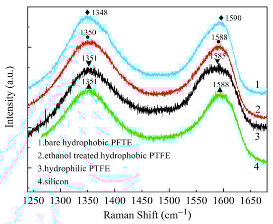 The Raman spectrums of GO on different substrates are shown in Figure 6. For the GO film on a silicon (Si) substrate, the D peak is at 1351 cm−1, which is caused by the symmetrical stretching vibration of sp2 hybrid carbon atoms in the aromatic ring. The G peak is at 1588 cm−1, which is generated by the stretching motion of the carbon cyclic ring and all the sp2 atom pairs of the long chain [22]. Since the D peak is related to the defect activation, the intensity ratio of the D peak to the G peak (ID/IG) is a critical parameter to characterize the defect density of GO. The smaller the ID/IG, the higher the degree of atomic ordering and the fewer defects of GO. The software Origin 2018 was used to perform fitting using Gaussian function, and the peak ratio ID/IG is calculated. The ID/IG of GO on the substrates of bare hydrophobic PTFE, ethanol-treated hydrophobic PTFE, hydrophilic PTFE, and silicon are 1.067, 1.063, 0.990, and 1.064, respectively. It means compare with the hydrophobic substrate, the GO on the hydrophilic PTFE substrate has the fewest defects [22,23].