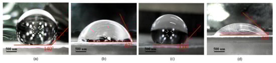 To compare the surface energy, the static water contact angles of different PTFE substrates were measured, as shown in Figure 7.