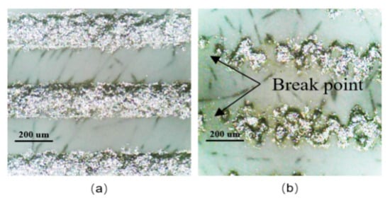 The typical morphology of well-printed electrodes and bad-printed electrodes are shown in Figure 8, respectively. An intact electrode without breaking is considered as a well-printed electrode, as shown in Figure 8a. The well-printed silver electrodes are conductive, which can operate normally as interdigital capacitors. As shown in Figure 8b, there are break points in the middle of the silver electrodes, which cannot conduct normally, and the electrodes like these are considered as bad-printed electrodes.