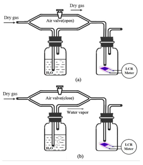 The dynamic test setup: (a) get dry gas (about 3% RH) when the valve is open; (b) get wet gas (about 96% RH) when the valve is closed.