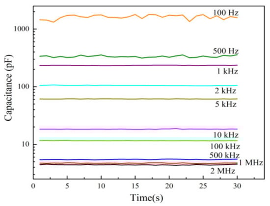 The capacitance of humidity sensors depends on the test frequency. As shown in Figure 10, the humidity sensor fabricated on an ethanol-treated hydrophobic PTFE substrate was tested at a series of frequencies from 100 Hz to 2 MHz under 25 °C and 60% RH. It can be observed that as the test frequency decreases, the capacitance of the sensor increases, while the noise is more significant at low frequencies. In order to get both large capacitance and low noise, 1 kHz is selected here as a test frequency.