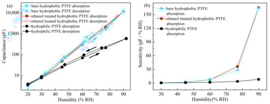 At low RH levels (<45% RH), sensors based on bare hydrophobic PTFE, ethanol-treated hydrophobic PTFE, and hydrophilic PTFE have the sensitivity of about 2.07 pF/% RH, 1.77 pF/% RH and 0.84 pF/% RH, respectively. At high RH levels (45 to 90% RH), the high sensitivity is obtained on the sensors on the bare hydrophobic PTFE and ethanol-treated hydrophobic PTFE substrates, which is 164.26 pF/% RH and 164.98 pF/% RH, respectively, whereas the sensitivity of the sensor on the hydrophilic PTFE is only 8.02 pF/% RH.