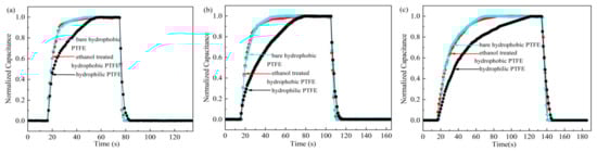 The dynamic responses (using N2) of sensors based on different PTFE substrates are shown in Figure 12a. The response/recovery time of the sensor is defined as the time to reach 90%/10% of the maximum output of the sensor as the relative humidity changes rapidly from 3% RH/96% RH to 96% RH/3% RH. After normalization of the measured capacitance value, the time when the normalized capacitance increases from 0.1 to 0.9 is defined as the response time. Similarly, the time when the normalized capacitance decreases from 0.9 to 0.1 is the recovery time.