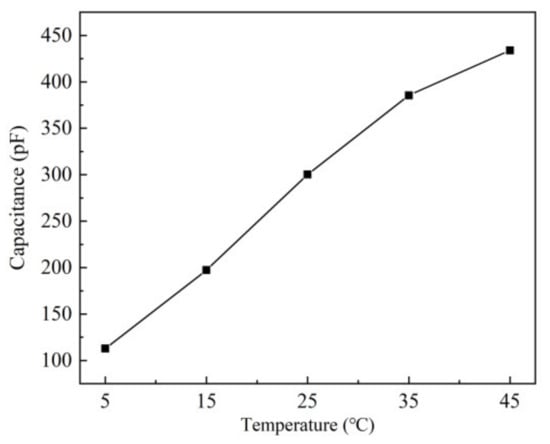 As the temperature rises, the output capacitance of the sensor increases. According to the hysteresis curve of humidity sensors in Figure 10, it can be estimated that under the constant 60% RH, the capacitances of the temperature from 5 °C to 45 °C, are corresponding to 52.4% RH to 64% RH at 25 °C. Thus, the humidity offset caused by the temperature is 0.29% RH/°C.