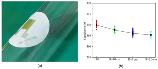 Effect of different bending conditions on sensor capacitance: (a) device; (b) results.