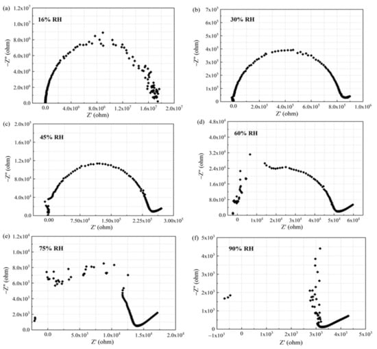 Complex impedance plots of the sensor based on ethanol-treated hydrophobic PTFE substrate under different humidity levels: (a) 16% RH, (b) 30% RH, (c) 45% RH, (d) 60%RH, (e) 75% RH, (f) 90% RH.