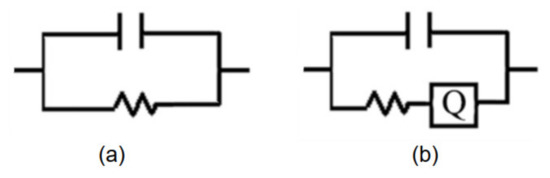 The semicircle in the Nyquist diagram represents the RC parallel network, and the low frequency tail represents the Warburg impedance caused by the diffusion mechanism. The equivalent circuit diagrams are shown in Figure 16. At low humidity (16% RH), the RC parallel network is selected as the electrical model of the sensor, as shown in Figure 16a. At moderate humidity (>30% RH), a straight line of Warburg impedance is generated in the low frequency range. A constant phase angle element Q is added to improve the electrical model of the sensor, as shown in Figure 16b.