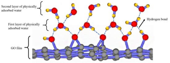 Schematic illustration for the humidity sensing mechanism of GO films. The first-layer water molecules are attached on GO through double hydrogen bonds. From the second layer, water molecules are adsorbed only through one hydrogen bond.