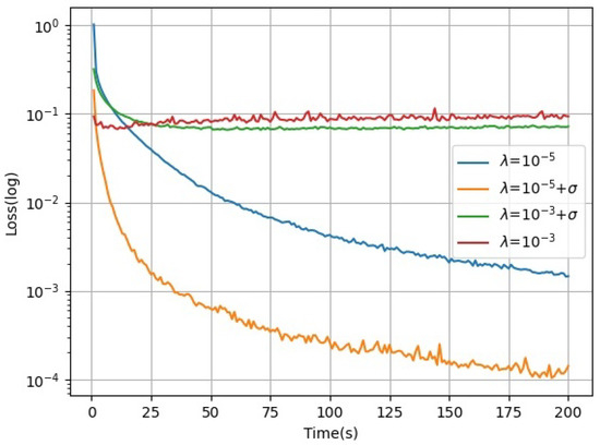 Learning rates with acceleration factors were evaluated and tested on independent working nodes using acceleration factors for linear regression tasks. The dataset used is SVHN [40], an open-source street view door number dataset from Google, as it is a classical dataset that works with linear regression tasks. The test results are presented in Figure 2, where the horizontal axis is the training time and the vertical axis is the loss function. To illustrate the effectiveness of the acceleration factor, a fast learning rate is artificially set, and it is clear from Figure 2 that the acceleration factor is still effective in accelerating the algorithm even if the fixed value is too heavy. The learning rate with the acceleration factor in model training converges faster than those without the acceleration factor. The learning rate in a small fixed-value fraction has a significant convergence effect on the machine learning model. The effect of the acceleration factor on the convergence of the machine learning algorithm can even be seen in the short term.