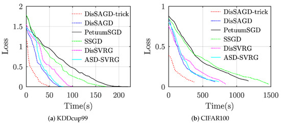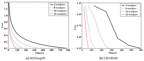 The convergence performance of the algorithm has been evaluated as shown in Figure 4. The machine learning algorithm uses asynchronous communication when the delay is set to 0.5 s. All datasets are allocated to four working nodes. As can be clearly seen from Figure 4, the method proposed in this paper outperforms the other baselines for all datasets, even though DisSAGD does not use our proposed accelerated optimization technique, which also outperforms the baseline, especially for KDDcup99. DisSAGD outperforms existing algorithms an asynchronous approach and update the parameters based on the mean gradient vector variance reduction. DisSAGD was set to use the optimization technique and only one-quarter and one-third of the KDDcup99 [42] and CIFAR-100 datasets, respectively. We found that the DisSAGD algorithm performance depends on the specific dataset, i.e., it does not exceed SSGD on KDDcup99, whereas it outperforms SSGD on Cifar100, but the overall convergence performance is better than the performance of ASD-SVRG, which significantly better than that of PetuumSGD and SSGD, and is close to that of DisSAGD (both have equal loss function values at a given time, but the performance of ASD-SVRG improves as time increases); on the other hand, the performance of ASD-SVRG is comparable to that of DisSAGD equivalent, but significantly inferior to the optimized DisSAGD (i.e., DisSAGD-tricks). The experimental results show that DisSAGD uses an asynchronous approach as well as a mean gradient vector variance reduction-based parameter update, and the learning rate with an acceleration factor acceleration the convergence, whereas the adaptive sampling strategy significantly reduces the waiting time for the server to distribute the global parameters.