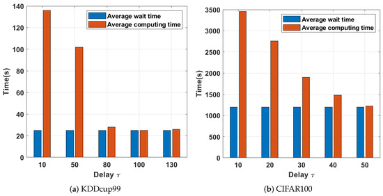 As shown in Figure 6, the average waiting time between nodes with a small is significant. The smaller implies a tight connection between the working nodes, which usually causes the working nodes with fast computation to spend time idle due to the updated method. When the latency is set to 0, the server downlinks global parameters to all working nodes in each global iteration, and each node participates in the computation, thus increasing the average waiting time of nodes. When the latency increases, the waiting time decreases sharply; therefore, setting a reasonable communication delay can effectively reduce the average waiting time. Although fast working nodes have more free time to iterate, slow working nodes cannot obtain new global parameters from the server within the large latency; therefore, slow worker nodes cannot benefit from fast worker nodes. The latency, if set, needs to be set according to different situations. The coordination between the working node waiting time and the computation time needs to be considered simultaneously. Empirically, the optimal setting of the delay should minimize the total time consumption of the distributed training. For the evaluation tests in this paper, we set to 200 and 50 for KDDcup99 and CIFAR100, respectively, which we obtained empirically.