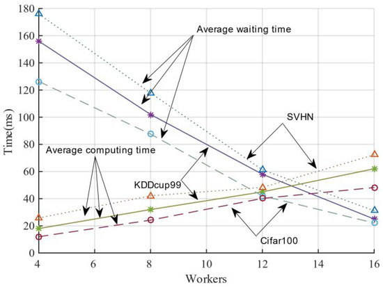 In order to investigate how many worker nodes set to interact with the server can better balance the difference between computation and waiting time, in this study, we initiated the computation of global parameters by collecting the model parameters of a specific number of worker nodes from the server and then iterated them across the distributed cluster. The results are shown in Figure 7. When the server aggregates the number of working nodes from 2 to 16, its average waiting time gradually decreases. Its average computation time gradually builds up when the number of nodes increases. Their average waiting time and average computation time intersect at a definite number of worker nodes for three datasets. In general, the average waiting time decrease is greater than the average computation time, indicating that the gain by specifying the number of working nodes is not as significant as that obtained by setting the delay time. The working nodes can be adaptively sampled for model training within the delay time, resulting in better efficiency and convergence performance.