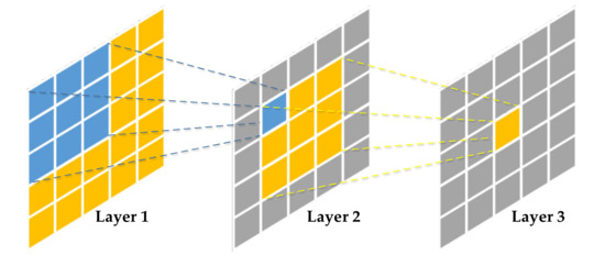 The receptive field refers to the input area that neurons can “see” in the CNN [25], as shown in Figure 1, the calculation of an element on the feature map in a CNN corresponds to a certain area on the input image, so the corresponding area is the receptive field of the element. It can be seen from Figure 1 that the receptive field is a relative concept, the elements on the feature map of a certain layer can see different areas on the previous layers.