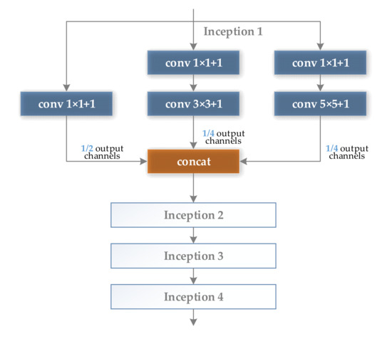 Figure 2 shows the structure of four simplified Inception modules connected in series, for the convenience of calculation, the ratio of the number of output feature maps of the three branches of 1 × 1, 3 × 3, and 5 × 5 is set to 2:1:1. Figure 3 shows the structure of two residual modules connected in series, and the output ratio of feature maps of all branches is set to 1:1.