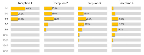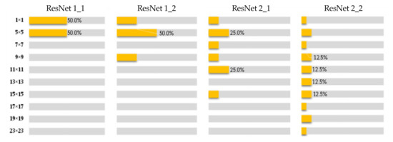 In addition, although in the distribution map of the fourth module in Figure 4 and Figure 5, three are still small receptive fields such as 1 × 1, 3 × 3, and 5 × 5, but as the convolutional neural network becomes deeper, these local receptive fields will gradually disappear. Table 2 shows the minimum and maximum receptive field scale distributions of the last layer of feature maps in the GoogLeNet and ResNet-18, it can be seen that the local receptive fields have disappeared and been replaced by macroscopic large and even super large receptive fields.