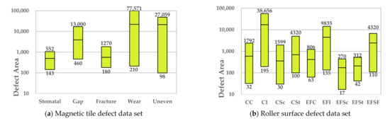 Figure 7 and Figure 8 respectively show samples with large differences in defect scales in the two datasets and their corresponding defect labeling positions, it can be seen that the size differences between different defect types are quite huge, which poses a great challenge to classification and recognition tasks. In addition, even for defects of the same type, the size of the defect varies from sample to sample. Figure 9 shows the area statistics of all defect types in the two datasets. It can be seen that in the defect data set of magnetic tile, the average area of wear defects and uneven defects is more than 60 times that of stomatal defects; the maximum defect area of the wear defect sample exceeds the maximum area of the stomatal defect sample by 140 times.