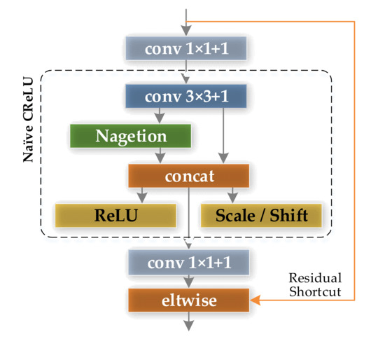The research of Shang et al. [33] revealed that in the early stage of feature extraction of CNNs, the filters in the lower layers form pairs, the phase of each pair of filters is opposite, that is, CNN has a tendency to learn both positive and negative phase information at the same time, however, the Rectified Linear Units (ReLU) [35] will suppress the negative response, making the feature of the lower convolutional layer of the CNN redundant. CReLU takes these negative responses as the output of the convolutional layer by inverting the feature map and then using the ReLU function, the structure of CReLU is shown in the dashed box in Figure 10. The above operation can convert redundant features into usable features, and extract twice as many feature maps, thereby improving the utilization of features in the lower convolutional layer of CNN. In this paper, the CReLU feature extraction module is designed on the basis of the native CReLU module, as shown in Figure 10. A 1 × 1 convolutional layer is added to the input and output of the native ReLU module to achieve dimensionality reduction and dimensionality increase of the number of convolution kernel channels, which increases the nonlinearity of CNNs and reduces the amount of calculation. In addition, the shortcut connections in ResNet are also introduced into the CReLU feature extraction module to reduce the loss of information in the transmission process and protect the integrity of the information.