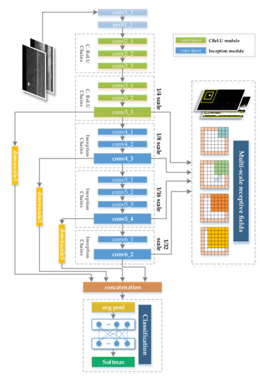 In order to increase the diversity of the receptive field of the last convolutional layer of CNNs and improve the ability to learn and express features of different scales, especially small and local features, MSF-Net aligns and integrates the feature outputs of several intermediate layers, and then the fully connected layer is used for classification. Figure 12 shows the overall architecture of MSF-Net, and Table 4 lists the specific parameters and indicators in detail. As can be seen from Figure 12, MSF-Net is mainly composed of five convolutional module chains in the feature extraction stage, including two optimized CReLU modules and three optimized Inception V3 modules. In addition, all convolutional layers in MSF-Net, except for the optimized CReLU modules, are designed with batch normalization (BN) layers, scale layers, and ReLU activation layer to better accelerate convergence.