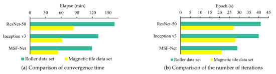 Figure 13 shows the comparison of the time and number of iterations required to reach convergence when the three CNN models are trained on two multi-scale surface defect data sets. It can be seen from Figure 13a that MSF-Net achieves convergence in the shortest time on the training performance of the two multi-scale surface defect data sets. Specifically, the convergence time of MSF-Net is shortened by at least 25% compared with that of ResNet-50, and it is also shortened by nearly 10% compared with that of Inception v3. Figure 13b shows the comparison of the number of epochs for the three models to reach convergence. Through the comparative analysis of three CNNs, it can be seen that the efficient training performance of MSF-Net mainly comes from the following two aspects: