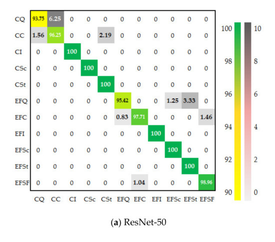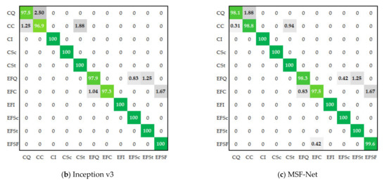 Table 7 and Figure 14 respectively show the classification performance of ResNet-50, Inception v3, and MSF-Net on the test of the surface defect data set of roller. It can be seen from Table 7 that the three CNNs have excellent performance in the defect categories of CI, CSs, CSt, EFI, EFSc, and EFSt, with an accuracy rate of 100%. In the remaining five categories, CQ and EFQ are non-defective samples; CC and EFC are small-size defects, and the appearance of the samples is very close to CQ and EFQ respectively, EFSF represents larger defect samples. Therefore, the roller surface defect data set is very suitable for the evaluation and verification of multi-scale feature learning capabilities of CNNs. ResNet-50 and Inception v3 achieved the highest recall rates in the EFC and EFSF defect categories, respectively, while MSF-Net performed better than the other two CNNs in the CC defect category. In addition, MSF-Net has an outstanding performance in the accuracy rate of CQ and EFQ, which has important application value in actual production. Overall, the average recall rate of MSF-Net on the roller defect set is 99.29%, while the recall rates of ResNet-50 and Inception v3 are 98.44% and 99.06%, respectively; at the same time, MSF-Net has the smallest standard deviation in recall rate, showing a more balanced expression and learning ability for defects of different scales. Similarly, compared with ResNet-50 and Inception v3, MSF-Net also achieves the best performance in precision, micro-F1 and macro-F1 indicators, which verified its superiority.