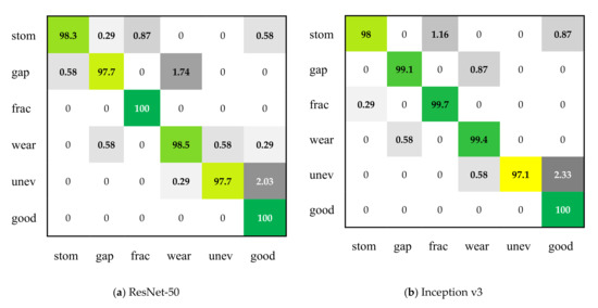 Confusion matrix of three CNNs on the surface defect data set of roller (unit: %).