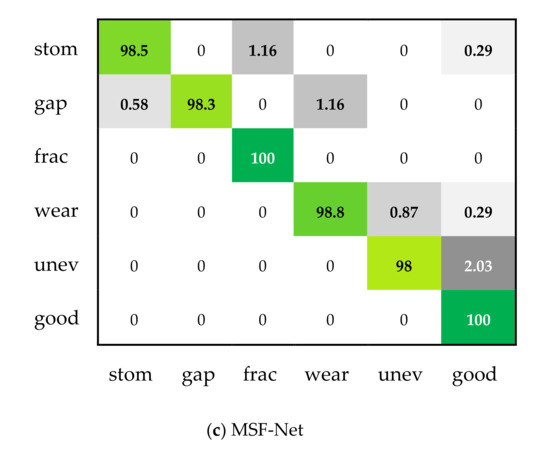 Table 8 and Figure 15 show the classification performance of ResNet-50, Inception v3, and MSF-Net on the test set of surface defect data set of magnetic tile. It can be seen from Table 8 that the three CNNs have excellent performance in the categories of fracture defects and good products. MSF-Net has the highest accuracy rate for stomatal and uneven defects, and Inception v3 has the best performance on the gap and wear defect categories. In general, the average recall rate of MSF-Net on the magnetic tile defect set reached 98.93%, while the recall rate of ResNet-50 and Inception v3 were 98.69% and 98.89% respectively; at the same time, among the three CNNs, MSF-Net has the smallest standard deviation in recall rate. Similarly, MSF-Net performs better on precision, micro-F1 and macro-F1 than ResNet-50 and Inception v3.