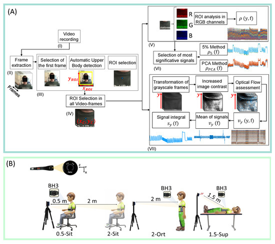 (A). Flowchart presenting the steps carried out to extract the respiratory pattern from image sequences. (B). Experimental set-up (0.5-Sit: user-camera distance of 0.5 m, sitting position; 2-Sit: user-camera distance of 2 m, sitting position; 2-Sta: user-camera distance of 2 m, standing position; 1.5-Sup: user-camera distance of 1.5 m, supine position). BH3: Bioharness, used as reference instrument.