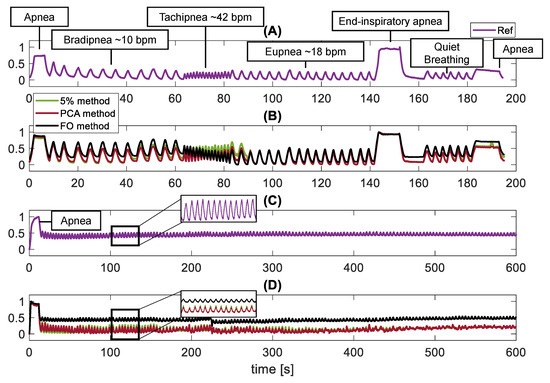 The collected videos were post-processed in MATLAB environment to extract the breathing patterns with the proposed algorithms. Per each trial, we retrieved , by processing the video-frames with the pixel intensity changes method and with the FO method. Therefore, the , and were synchronized with the reference signal (hereafter, ) by using the first and last apneas as common events (see Figure 3A). A third-order Butterworth low-pass filter with a cut-off frequency of 2 Hz was applied to all the signals [18]. This choice preserves the constant signal related to apnea and, at the same time, deletes the high frequencies related to noise, guaranteeing a wide range of detectable values (i.e., up to 120 bpm).