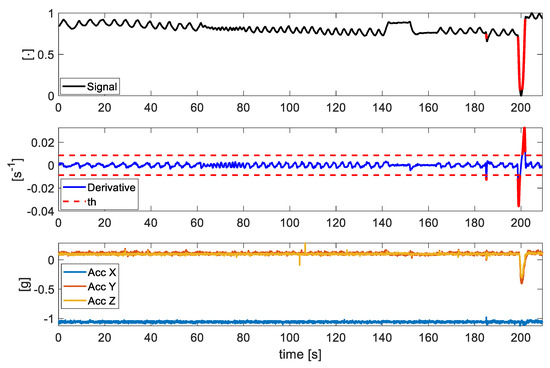 As an example, the first subplot in Figure 4 shows a signal extracted using the FO method in which the portions identified as artefacts are automatically highlighted in red, according to the threshold method defined above and showed in the second subplot. This is supported by the third subplot in which the X, Y, and Z axis of the accelerometer inside the BH3 are reported. The acceleration magnitude shows large variations in correspondence with the event recognized. In all the trials that present motion artefacts, the events were correctly identified and removed from the , and signals (data are not shown).