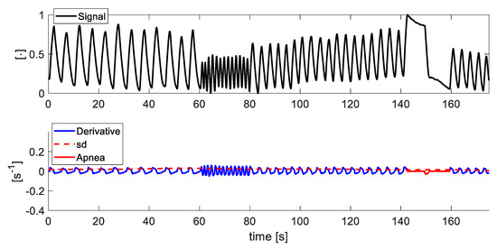 - Whether the derivative of the signal is less than the previously calculated standard deviation for at least 10 s (in accordance with guidelines in [32]), the signal at those points is identified as apnea.