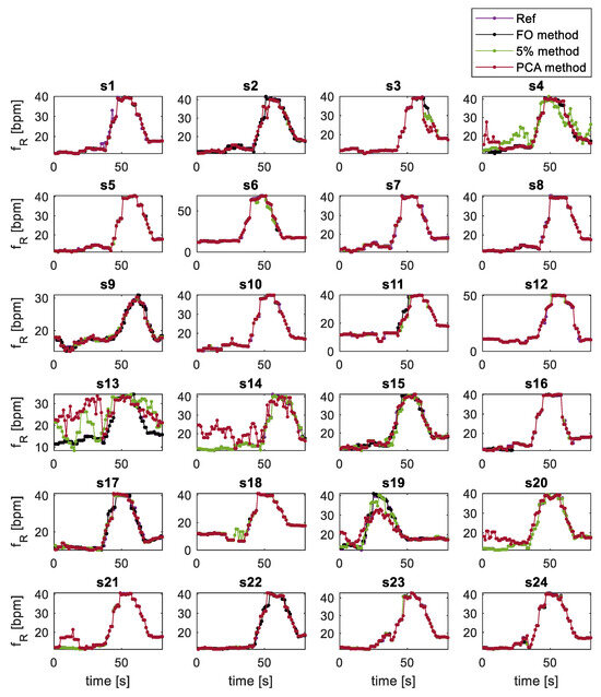 An example in which the extracted second-by-second respiratory rate values for all subjects with all extraction techniques is shown in Figure 6. The trends of extracted with all methods show a first part in which the signal is settled around 10 bpm, followed by an increasing respiratory rate of about 42 bpm that finally falls to about 18 bpm according to the protocol. From the Figure 6 for all subjects, except for subjects 4, 13, 14, 19, there is almost complete overlap of the 3 methods with the reference. On the other hand, in the above-mentioned subjects there is a not very good overlap of the 5% method and PCA method with the reference, while the FO method is almost completely overlapped. These errors are quantified with the histograms shown in Figure 7 and with the Bland Altman plots showed in Figure 8.