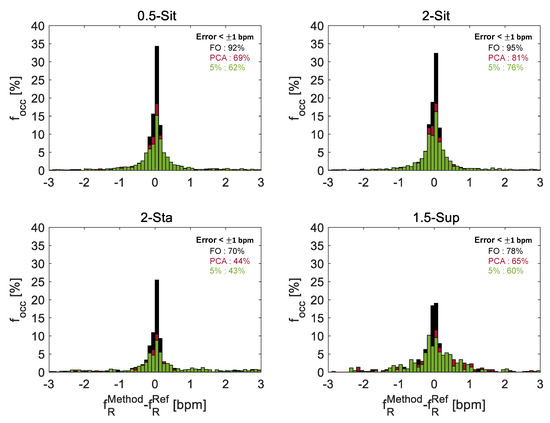 The values obtained each second from , and were compared to those obtained from . Figure 7 reports the distribution of the differences between values computed from each method (i.e., 5%, PCA, FO) and those calculated by the reference (i.e., ), by considering all the volunteers in the different trials. In all the postures, the FO method showed lower errors than the other two methods: the best results are achieved in 2-Sit trial using the FO method, of values presented errors below bpm when compared to reference values, while in the 5% method and the PCA method only the and of values were in that range, respectively.