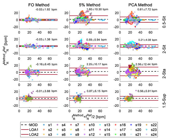 Bland–Altman analysis using the values obtained by the video signal collected for each subject (shown in different colours) posture and for each technique of extracting movement from images. The black dashed line represents the mean of difference (MOD); the two upper and lower lines represent the confidence interval given by the mean ± the 95% of the standard deviation of the points (LOAs). MOD can be interpreted as an indicator of the accuracy of the system and its value represents the systematic error of the proposed method to the reference. The smaller the variation of the mean within the confidence interval, the more likely it is that the two methods can be considered interchangeable.