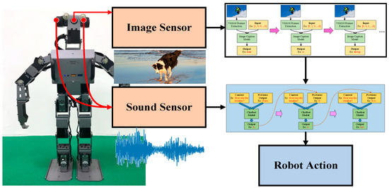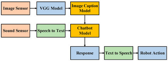 The overview of the proposed framework is illustrated in Figure 1. Prior to undergoing any training, the chatbot can be said to be like a baby—incapable of anything. But after going through correct learning, the chatbot slowly becomes more human-like and gains the ability to communicate with people. The training process resembles the process by which adults teach children to recognize objects, typically holding a picture and telling the child, “This is a dog”. Although the ability to express oneself in words may not be entirely present during the initial training, the rate of failure can be reduced through continuous training. Therefore, we can use this process to enable robots to develop cognitive abilities regarding their surroundings. This process is the same as teaching children to speak, that is, developing their ability to speak through continuous conversations and correcting their mistakes. Teaching robots is the same—although the bot may answer incorrectly in the beginning, through continuous learning, they can learn to have normal conversations with people. The concept map of this paper is presented in Figure 2; the chatbot can perform analyses based on current image data. When the user asks questions, not only is the chatbot able to make considerations based on the environmental data it currently detects, the bot is also able to generate a corresponding response based on the conversation context. The benefit of this method is in the integration of multiple pieces of data, allowing the chatbot to better make responses focusing on relevant questions. In this manner, the bot’s responses become more precise and more in line with reality.