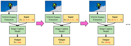 Figure 8 presents the operations of the image caption model; the figure demonstrates that the image caption model can also be split into left-hand and right-hand inputs. The left-hand inputs are image-related; after an image is input into the model, we must first use VGG16 [22] to perform the task of feature extraction. The VGG16 model used in this paper is a complete model that has already been trained using a large volume of picture data. The final output layer of the original was not necessary for this work; but because this model had already been trained, the final output layer was eliminated, and the other parts were treated as excellent feature extraction tools. If we input an entire picture into the image caption model from the beginning, this may result in training issues from overly large input data. The use of the feature extraction method reduces the input dimensions and can present the picture’s data in the most streamlined and adequate manner as vectors. The image caption model’s right-hand inputs are a series of one-hot vectors that represent the current sequence of the output text. After repeated iterative processes, the image caption model describes the image in text by generating the text word-by-word to present a complete sentence.
