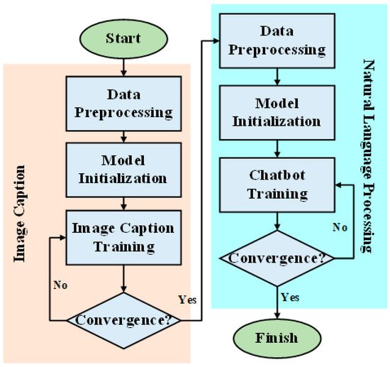 The process can be split into two major sections: the first section is the image caption model, and the second part is the natural language processing part. In the image caption model, we first perform preprocessing on the data by consolidating and coding all the image data and the labeled text data. Then, after we initialize the model, we conduct model training. In the training process, we must observe whether the convergence conditions have been satisfied; if not, then training must be continued. If the text caption model training is complete, then the process enters its next stage. In the natural language processing part, the first and most crucial task is still the data preprocessing, followed by the initialization of the chatbot model. Next, training of the chatbot model must be performed using the processed data. Similarly, if the chatbot model does not satisfy the convergence conditions, the training must continue. Conversely, if the chatbot model has satisfied the convergence conditions, the training immediately ends. When the convergence conditions are met, the entire training process is complete. However, the image caption model must be trained first because this model plays a key role in incorporating image information in the chatbot input. If the image caption model is inadequately trained, the image information input into the chatbot becomes meaningless and may result in erroneous interpretation. After the training of the image caption model is completed, it can be used to convert image information to textual information, which is then fed to the input end of the chatbot. This conversion approach enables a chatbot model to be constructed without substantial modification. This also allows the model to interpret image information, which is a primary focus of this study. The problem of overfitting was considered during the training process, which was terminated immediately when overfitting occurred.