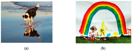 Training samples in Flickr 8 k [24]: (a) caption: “A dog at the beach”; and (b) caption: “A little girl covered in paint sits in front of a painted rainbow with her hands in a bowl”..